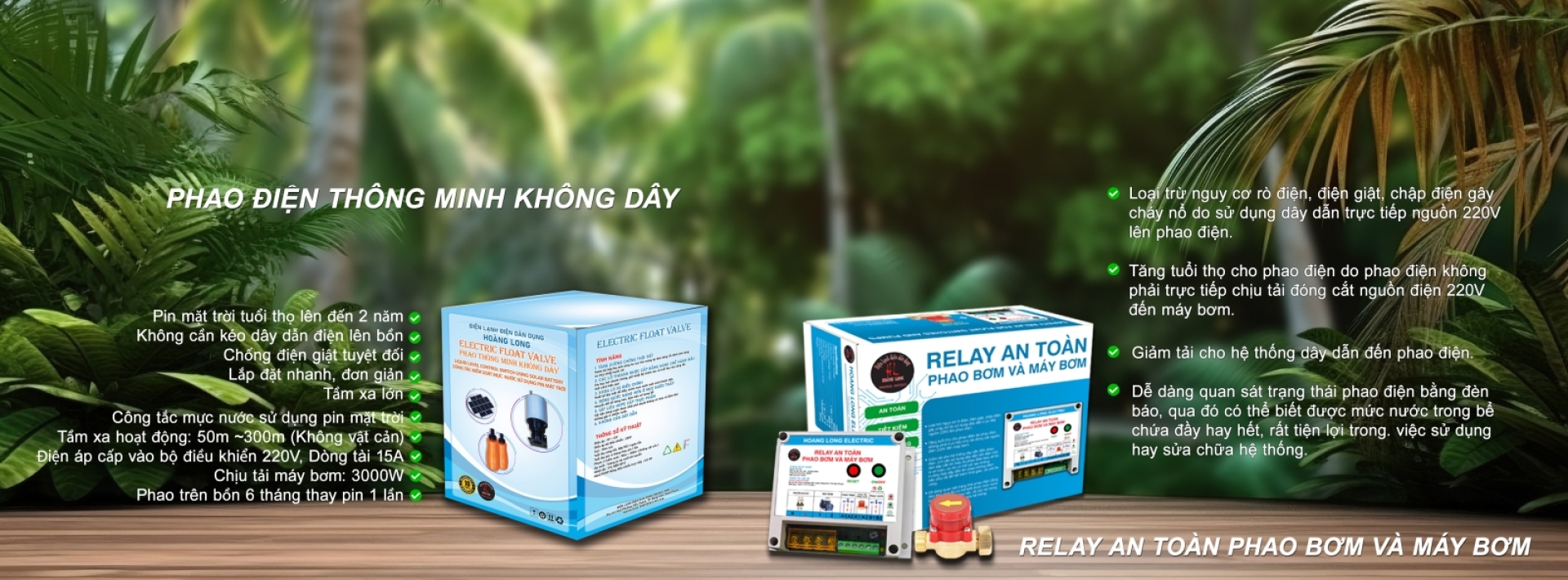 Hoàng Long Electric giới thiệu hai sản phẩm mới, mang đến giải pháp an toàn tối đa cho hệ thống bơm nước của bạn: Relay An Toàn Phao Bơm Và Máy Bơm, loại bỏ nguy cơ rò điện, điện giật, và chập điện, kéo dài tuổi thọ cho phao điện, giảm tải hệ thống dây dẫn, và có đèn báo trạng thái phao điện; Phao Điện Thông Minh Không Dây, sử dụng pin mặt trời có tuổi thọ 2 năm, đảm bảo chống điện giật tuyệt đối, lắp đặt nhanh chóng, hoạt động từ 50m đến 300m (không vật cản), công tắc mực nước chịu tải máy bơm lên đến 3000W, cần thay pin mỗi 6 tháng.