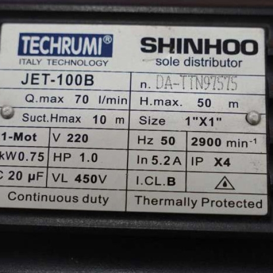 Máy bơm nước Techrumi JET-100B được trang bị các thông số kỹ thuật vượt trội, đảm bảo hiệu suất và độ bền cao: